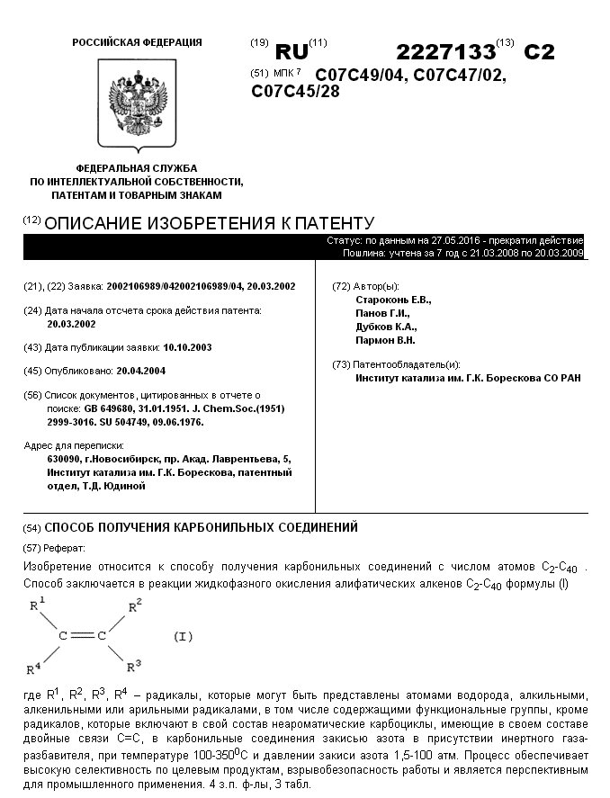 - Пат. 2227133 Российской Федерации, МПК C07C 49/04, C07C 47/02, C07C 45/28. Способ получения карбонильных соединений / Староконь Е.В., Панов Г.И., Дубков К.А., Пармон В.Н.; патентообладатель Институт катализа СО РАН. - N 2002106989/04; заявл. 20.03.02; опубл. 20.04.04, Бюл. N 11, ч. ІІI. - 7 с.