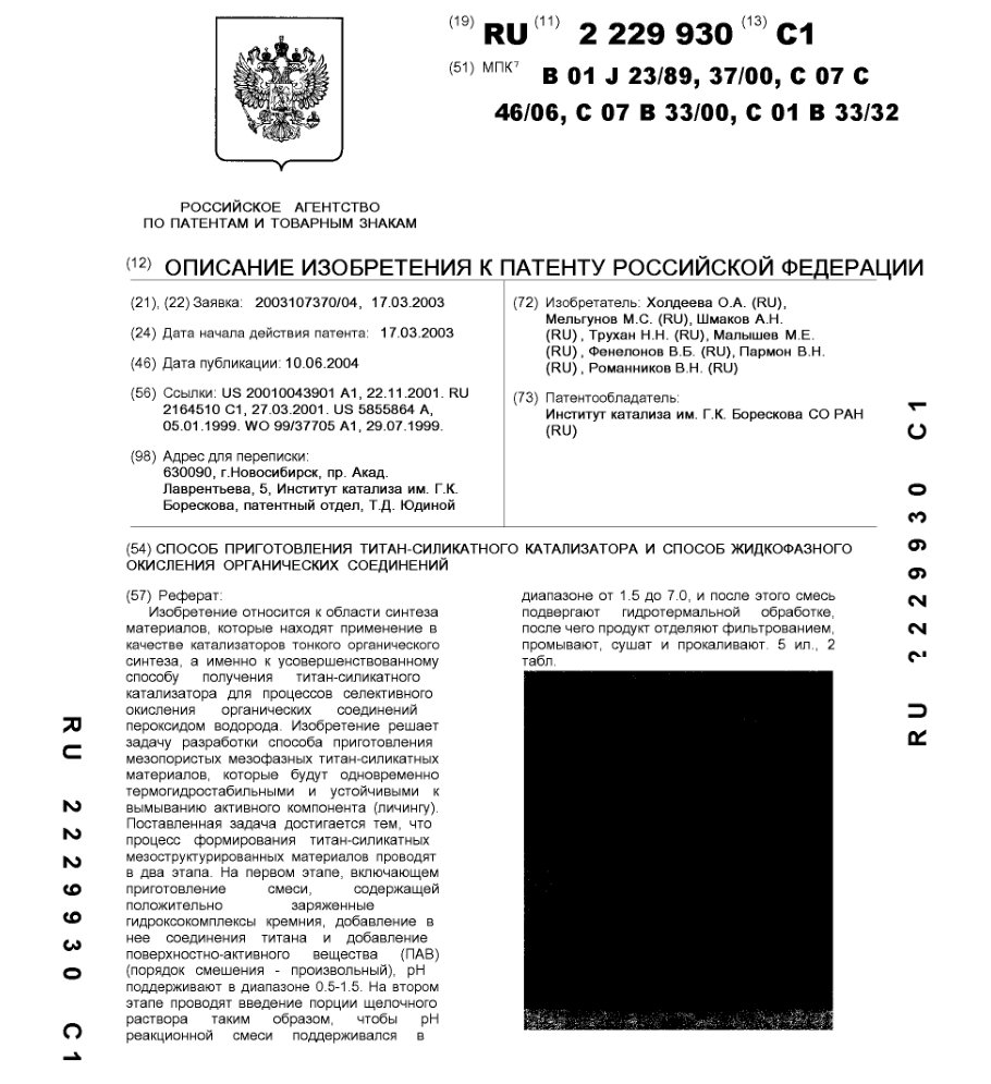 - Пат. 2229930 Российской Федерации, МПК B01J 23/89, B01J 37/00, C07C 46/06, C07B 33/00, C01B 33/32. Способ приготовления титан-силикатного катализатора и способ жидкофазного окисления органических соединений / Холдеева О.А., Мельгунов М.С., Шмаков А.Н., Трухан Н.Н., Малышев М.Е., Фенелонов В.Б., Пармон В.Н., Романников В.Н.; патентообладатель Институт катализа СО РАН. - N 2003107370/04; заявл. 17.03.03; опубл. 10.06.04, Бюл. N 16, ч. ІІ. - 15 с.: ил.