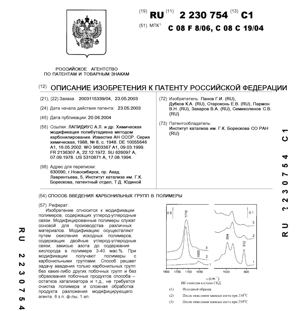 - Пат. 2230754 Российской Федерации, МПК C08F 8/06, C08C 19/04. Способ введения карбонильных групп в полимеры / Панов Г.И., Дубков К.А., Староконь Е.В., Пармон В.Н., Захаров В.А., Семиколенов С.В.; патентообладатель Институт катализа СО РАН. - N 2003115339/04; заявл. 23.05.03; опубл. 20.06.04, Бюл. N 17, ч. ІІ. - 5 с.: ил.