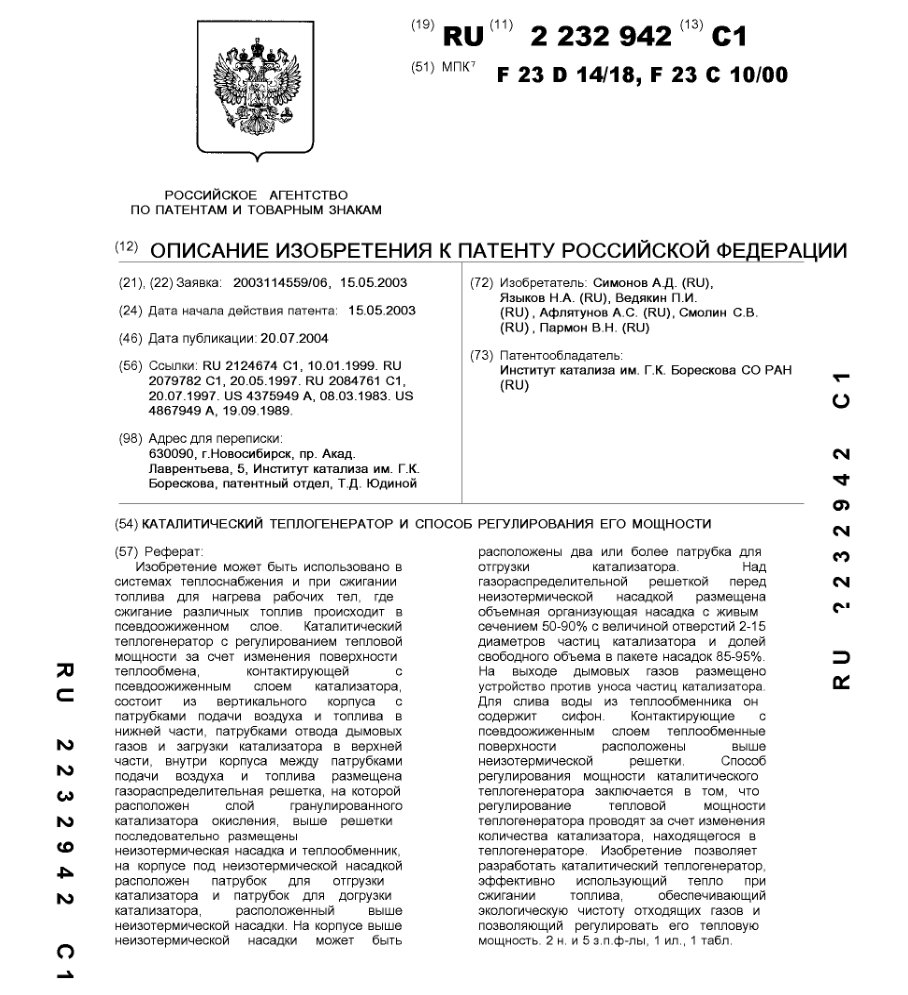 - Пат. 2232942 Российской Федерации, МПК F23D 14/18, F23C 10/00. Каталитический теплогенератор и способ регулирования его мощности / Симонов А.Д., Языков Н.А., Ведякин П.И., Афлятунов А.С., Смолин С.В., Пармон В.Н.; патентообладатель Институт катализа СО РАН. - N 2003114559/06; заявл. 15.05.03; опубл. 20.07.04, Бюл. N 20, ч. ІІ. - 7 с.: ил.