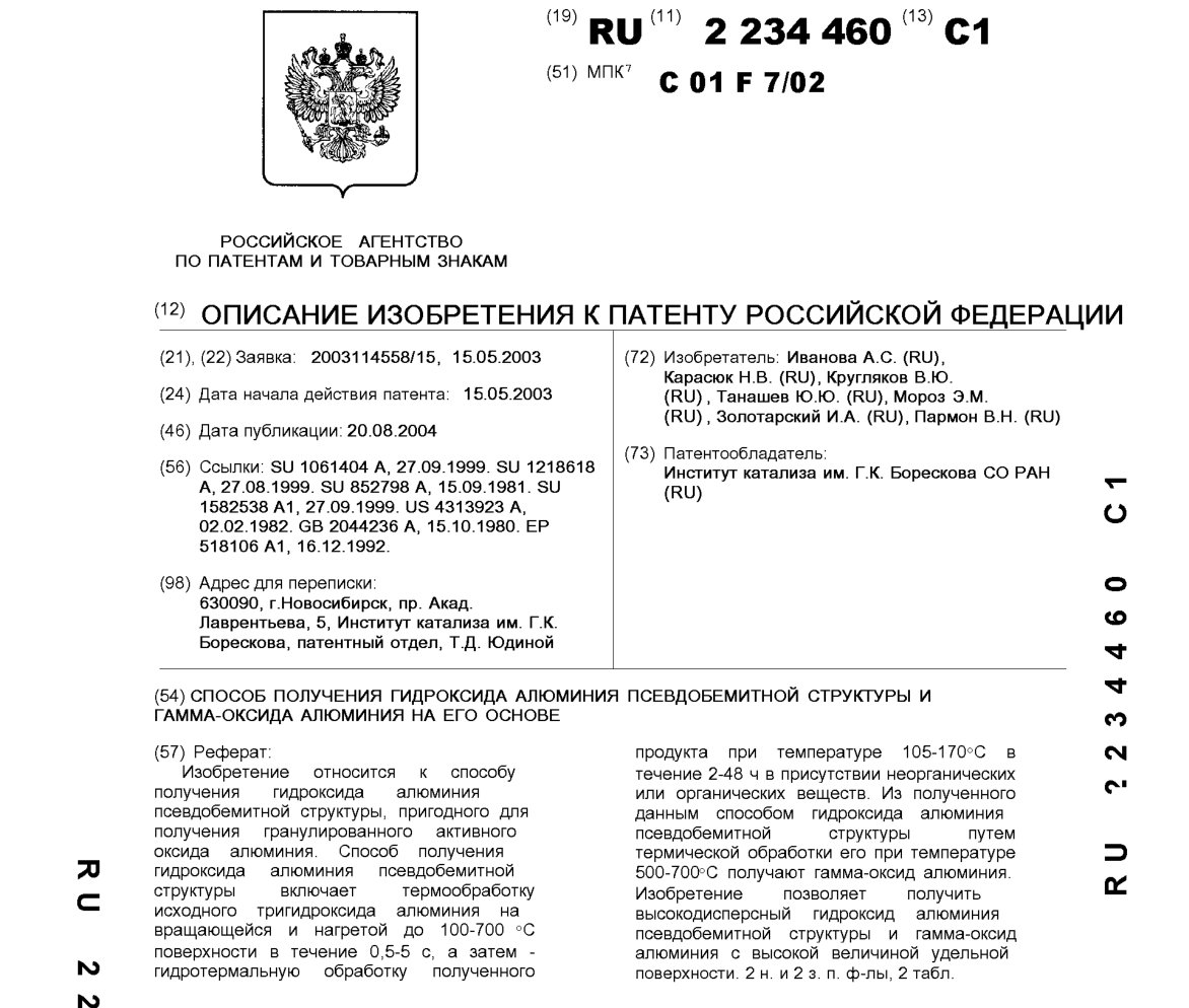 - Пат. 2234460 Российской Федерации, МПК C01F 7/02. Способ получения гидроксида алюминия псевдобемитной структуры и гамма-оксида алюминия на его основе / Иванова А.С., Карасюк Н.В., Кругляков В.Ю., Танашев Ю.Ю., Мороз Э.М., Золотарский И.А., Пармон В.Н.; патентообладатель Институт катализа СО РАН. - N 2003114558/15; заявл. 15.05.03; опубл. 20.08.04, Бюл. N 23, ч. ІІ. - 6 с.
