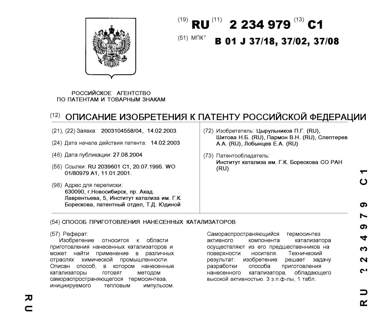 - Пат. 2234979 Российской Федерации, МПК B01J 37/18, B01J 37/02, B01J 37/08. Способ приготовления нанесенных катализаторов / Цырульников П.Г., Шитова Н.Б., Пармон В.Н., Слептерев А.А., Лобынцев Е.А.; патентообладатель Институт катализа СО РАН. - N 2003104558/04; заявл. 14.02.03; опубл. 27.08.04, Бюл. N 24, ч. ІІI. - 7 с.