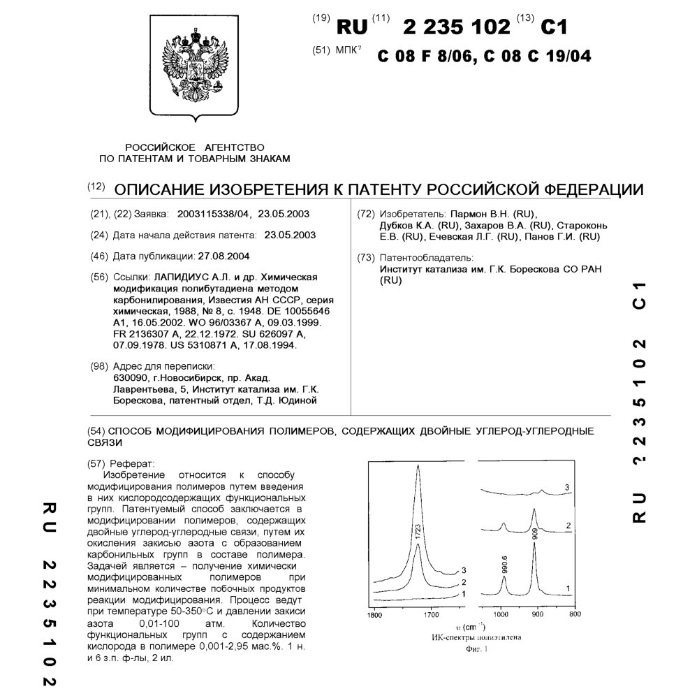- Пат. 2235102 Российской Федерации, МПК C08F 8/06, C08C 19/04. Способ модифицирования полимеров, содержащих двойные углерод-углеродные связи / Пармон В.Н., Дубков К.А., Захаров В.А., Староконь Е.В., Ечевская Л.Г., Панов Г.И.; патентообладатель Институт катализа СО РАН. - N 2003115338/04; заявл. 23.05.03; опубл. 27.08.04, Бюл. N 24, ч. ІІI. - 7 с.: ил.