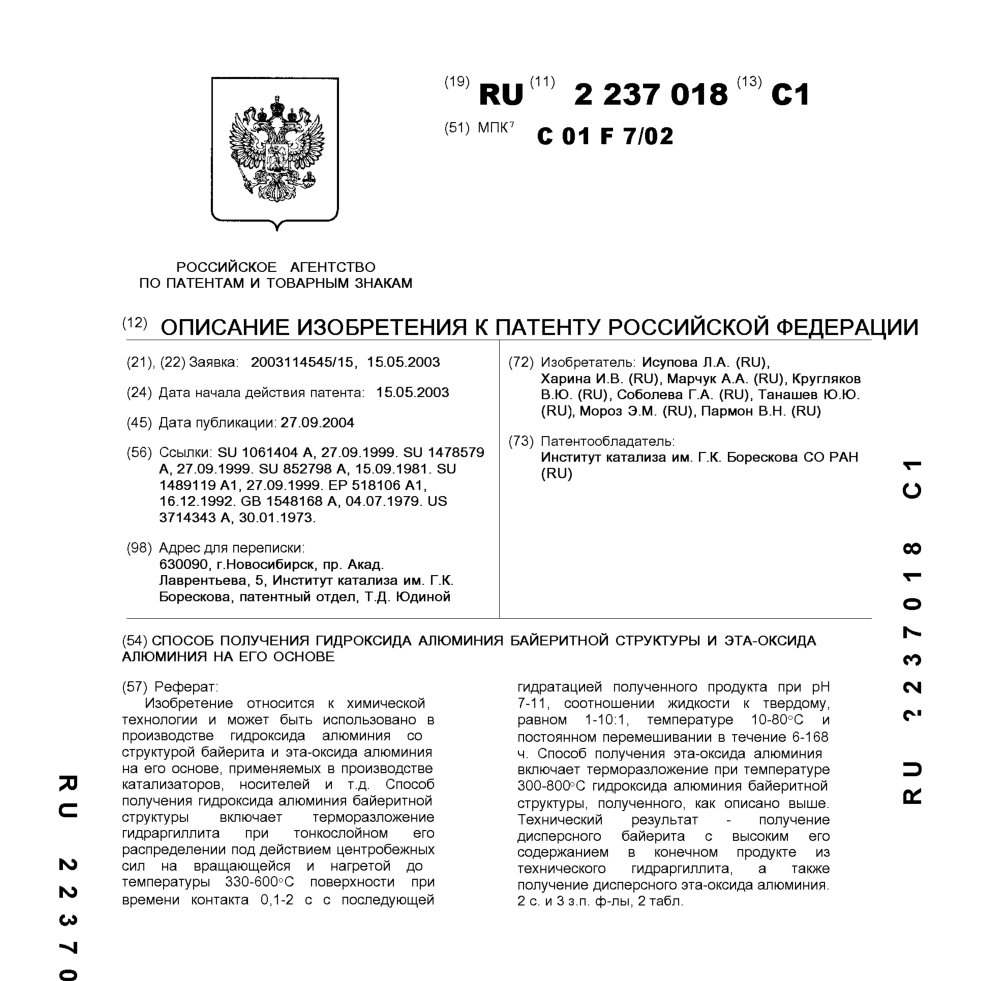 - Пат. 2237018 Российской Федерации, МПК C01F 7/02. Способ получения гидроксида алюминия байеритной структуры и эта-оксида алюминия на его основе / Исупова Л.А., Харина И.В., Марчук А.А., Кругляков В.Ю., Соболева Г.А., Танашев Ю.Ю., Мороз Э.М., Пармон В.Н.; патентообладатель Институт катализа СО РАН. - N 2003114545/15; заявл. 15.05.03; опубл. 27.09.04, Бюл. N 27, ч. ІІ. - 8 с.: ил.
