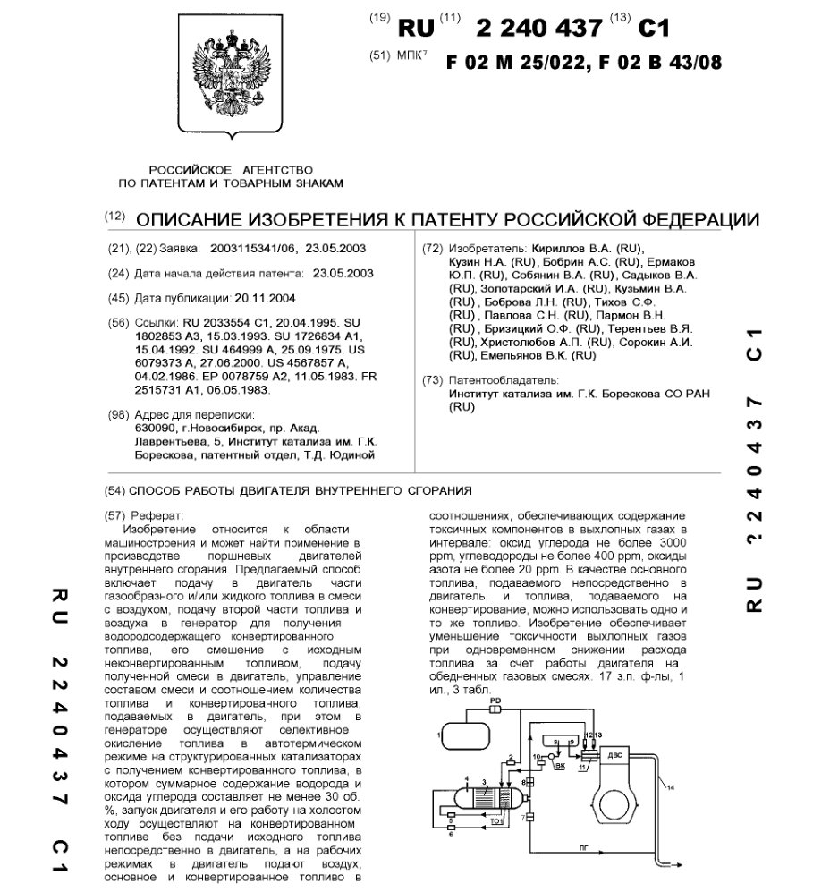 - Пат. 2240437 Российской Федерации, МПК F02M 25/022, F02B 43/08. Способ работы двигателя внутреннего сгорания / Кириллов В.А., Кузин Н.А., Бобрин А.С., Ермаков Ю.П., Собянин В.А., Садыков В.А., Золотарский И.А., Кузьмин В.А., Боброва Л.Н., Тихов C.Ф., Павлова C.Н., Пармон В.Н., Бризицкий О.Ф., Терентьев В.Я., Христолюбов А.П., Сорокин А.И., Емельянов В.К.; патентообладатель Институт катализа СО РАН. - N 2003115341/06; заявл. 23.05.03; опубл. 20.11.04, Бюл. N 32, ч. ІІI. - 12 с.: ил.