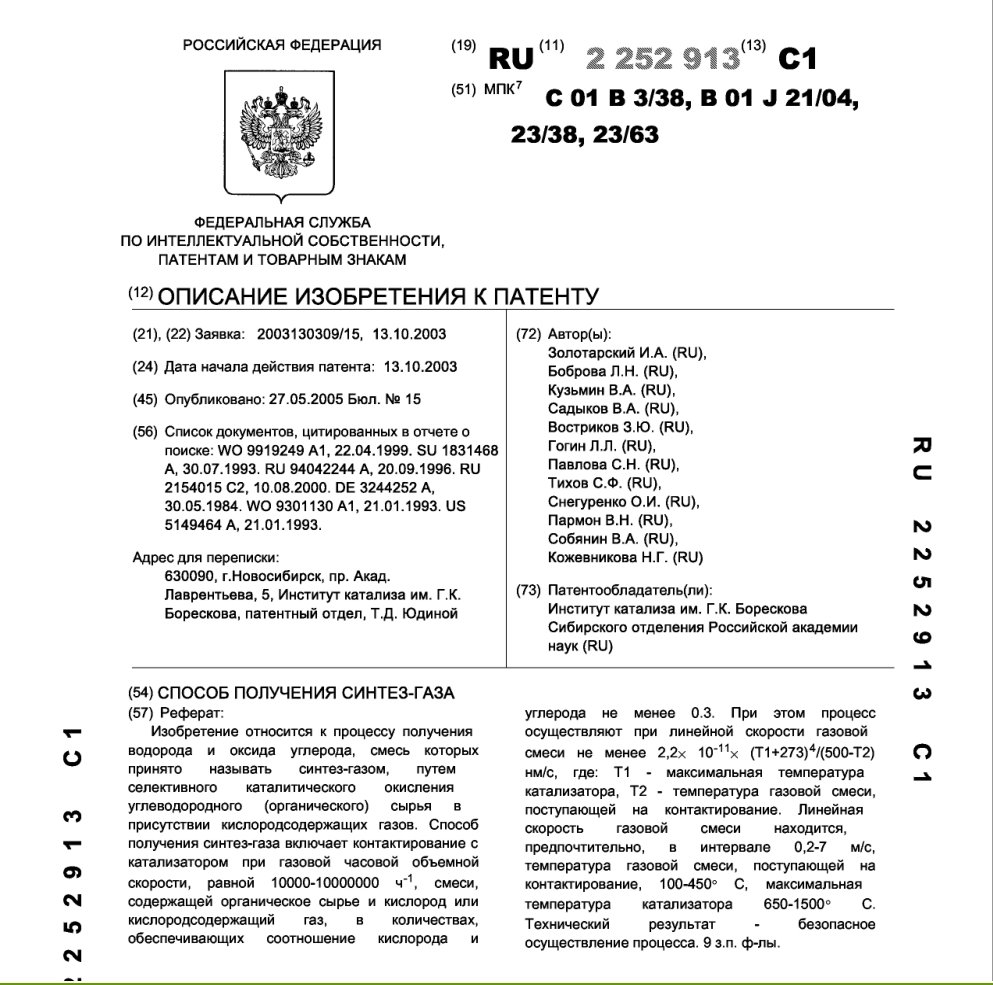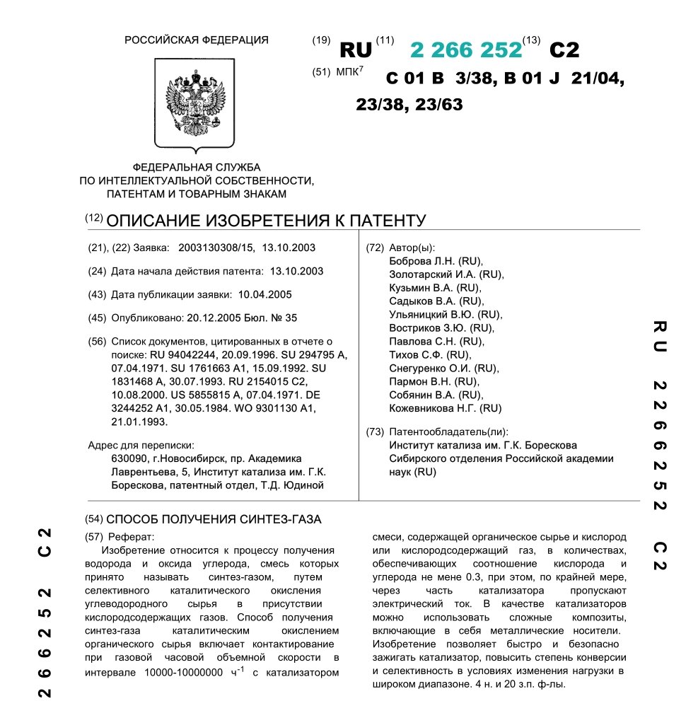 - Пат. 2266252 Российской Федерации, МПК C01B 3/38, B01J 21/04, B01J 23/38, B01J 23/63. Способ получения синтез-газа / Боброва Л.Н., Золотарский И.А., Кузьмин В.А., Садыков В.А., Ульяницкий В.Ю., Востриков З.Ю., Павлова C.Н., Тихов C.Ф., Снегуренко О.И., Пармон В.Н., Собянин В.А., Кожевникова Н.Г.; патентообладатель Институт катализа СО РАН. - N 2003130308/15; заявл. 13.10.03; опубл. 20.12.05, Бюл. N 35, ч. ІІ. - 9 с.