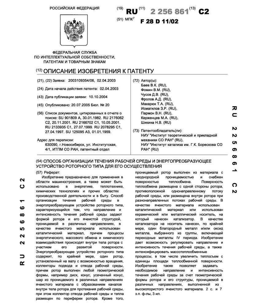 - Пат. 2256861 Российской Федерации, МПК F28D 11/02. Способ организации течения рабочей среды и энергопреобразующее устройство роторного типа для его осуществления / Баев В.К., Фомин В.М., Чусов Д.В., Фролов А.Д., Макарюк Т.А., Исмагилов З.Р., Пармон В.Н., Керженцев М.А., Шикина Н.В.; патентообладатели Институт теоретической и прикладной механики СО РАН, Институт катализа СО РАН. - N 2003109354/06; заявл. 02.04.03; опубл. 20.07.05, Бюл. N 20, ч. ІІI. - 9 с.: ил.