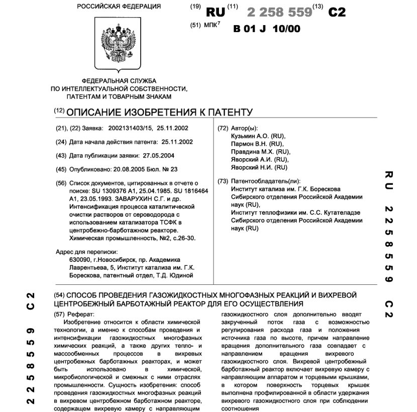 - Пат. 2258559 Российской Федерации, МПК B01J 10/00. Способ проведения газожидкостных многофазных реакций и вихревой центробежный барботажный реактор для его осуществления / Кузьмин А.О., Пармон В.Н., Правдина М.Х., Яворский А.И., Яворский Н.И.; патентообладатели Институт катализа СО РАН, Институт теплофизики СО РАН. - N 2002131403/15; заявл. 25.11.02; опубл. 20.08.05, Бюл. N 23, ч. ІІ. - 14 с.: ил.