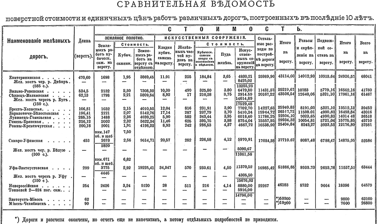 Просмотрим поверстные стоимости работ, представляющие разницу. На Ромны-Кременчугской дороге поверстная стоимость устройства полотна 4.198 руб., при 2.001 куб. саж. на версту, на Самаро-Уфимской - 9.614 р., при 2.820 куб. саж.; при этом на последней есть работы, особенно тяжелые, - встретились каменные выемки, в количестве 66.894 куб. саж., оплаченные по 7 р. 50 к., переход через Общий Сырт между 305 и 373 верстами (на этих 68 верстах 373.000 куб. саж. земляных работ, т.е. по 5.200 куб. саж. на версту, произведены по 2 р. 75 к.); объем земляных работ последних 6-ти верст, от 445 до 451 вер., достигает 166.000 куб. саж., т.е. в среднем на версту 27.700 куб. саж. (в них входит дамба по разливу р. Белой, высотой до 10 саж., идущая по болоту, с объемом в 106.000 куб. саж. и отвод большой р. Демы 25.000 куб. саж., с подводными работами; как дамба, так и русло произведены по 4 руб. 25 коп. за куб. саж.). Это работы исключительные, с которыми нужно считаться и которые нельзя принимать за заурядные. Для правильного сравнения единичных цен обеих линий следует вычесть разницу, составленную поименованными исключительными работами. Принимая цену земляных работ Ромны-Кременчугской дороги около 2-х рублей за кубическую сажень, за нормальную, найдем, что на Самаро-Уфимской произведены переплаты: за каменные выемки на 66.894 куб. саж. по 5 р. 50 коп. - 368.000 руб., на дамбе и отводе на 131.000 куб. с. по 2 р. 25 к. - 294.000 руб., а всего 662.000 р., что падает на куб. саж. общего количества земляных работ (1.284.800 к. с.) по 51 копейки; вычтя это удорожание из единичной цены обыкновенных грунтов (по отчету 2 р. 56 к.), получим 2 руб. 5 коп. - цена весьма небольшая, при 2.800 куб. саж. на версту, т.е. при сравнительной трудности работ, весьма близкая к единичной цене Ромны-Кременчугской и ниже почти всех остальных линий. Следовательно, относительно высшая поверстная стоимость устройства полотна происходит только от большого поверстного количества работ и тяжелого их свойства. Разность более дорогой поверстной стоимости искусственных сооружений совершенно ясна из приведенной таблицы; единичная цена кубической сажени кладки, с устройством оснований, на Самаро-Уфимской д. 226 руб. - ниже Ромны-Кременчугской (286 руб.), но среднее количество кладки на версту на первой 20 куб. саж. - в 2½ раза больше, чем на второй (8 куб. саж.); поэтому если на Ромны-Кременчугской стоимость сооружений на версту 4.667 руб., то, соответственно, на Самаро-Уфимской она должна бы быть по ценам Ромны-Кременчугской дороги 11.600 руб., а прибавляя стоимость моста через р. Белую (5.090 руб. на версту), всего 16.690 руб., в действительности же стоимость эта 11.061 рубль, следовательно, весьма дешевая, из чего не следует, что на Ромны-Кременчугской она была высокая: несомненно, там камень или устройство оснований обходились дороже. Если произвести сравнение для Уфа-Златоустовской дороги, то таким же анализом, из таблицы и отчета, можно убедиться, что действительная стоимость Уфа-Златоустовской дороги весьма умеренная и нисколько не выше других, а высокая ее поверстная стоимость происходит исключительно вследствие значительного количества и трудности работ. Как по количеству работ, так и их свойству, к Уфа-Златоустовской ближе других подходит дорога Новороссийская, и стоимости их, как видно из таблицы, почти одинаковые: Уфа-Златоустовская 63.444 руб. на версту, а Новороссийская 64.579 руб. Г. Гарин спрашивает: «почему на Уфа-Златоусто