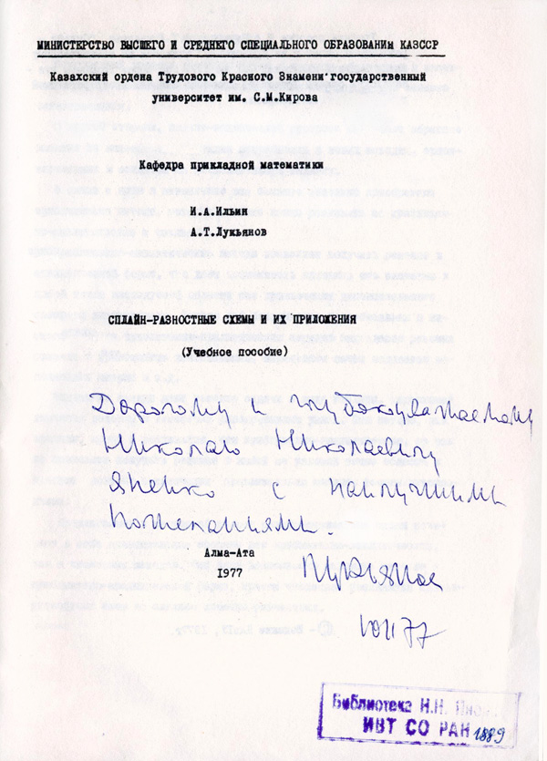 Ильин И.А. Сплайн-разностные схемы и их приложения / И.А.Ильин, А.Т.Лукьянов; Министерство высшего и среднего спец. образования КазСССР, Казахский ордена Трудового Красного Знамени гос. ун-т им. С.М. Кирова. - Алма-Ата: [б. и.], 1977. - 67 с.