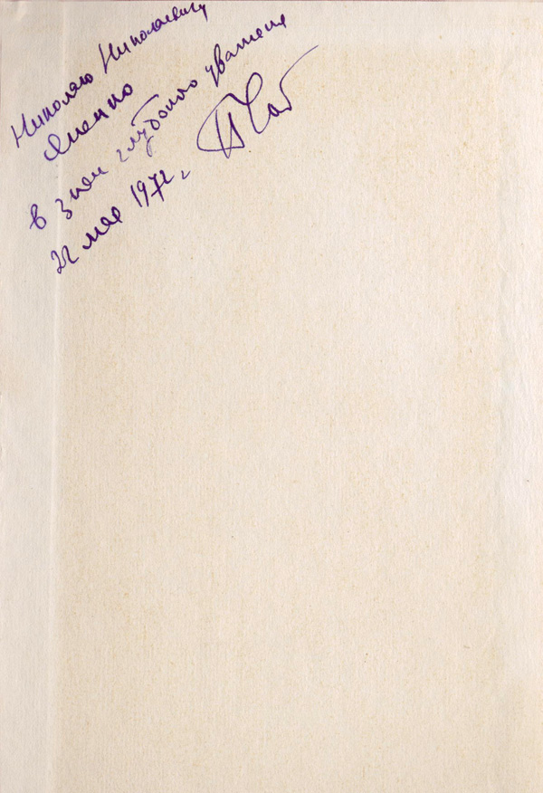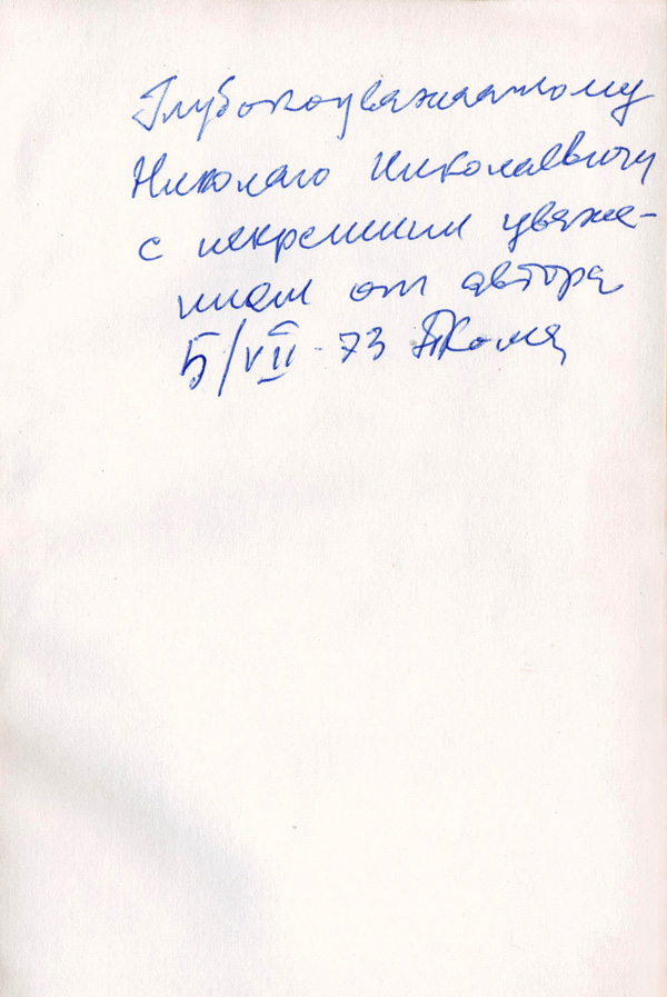 Автограф: Глубокоуважаемому Николаю Николаевичу с искренним уважением от автора. 5/VII-73.