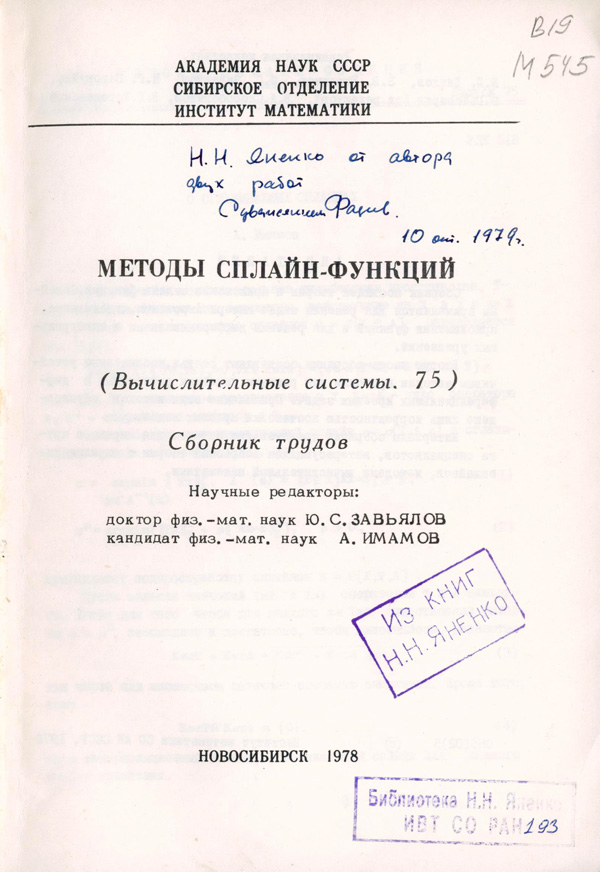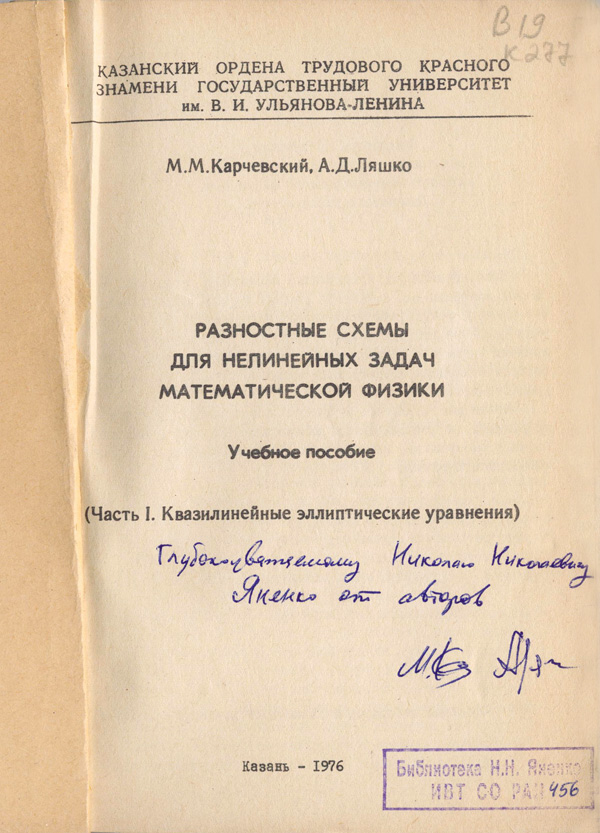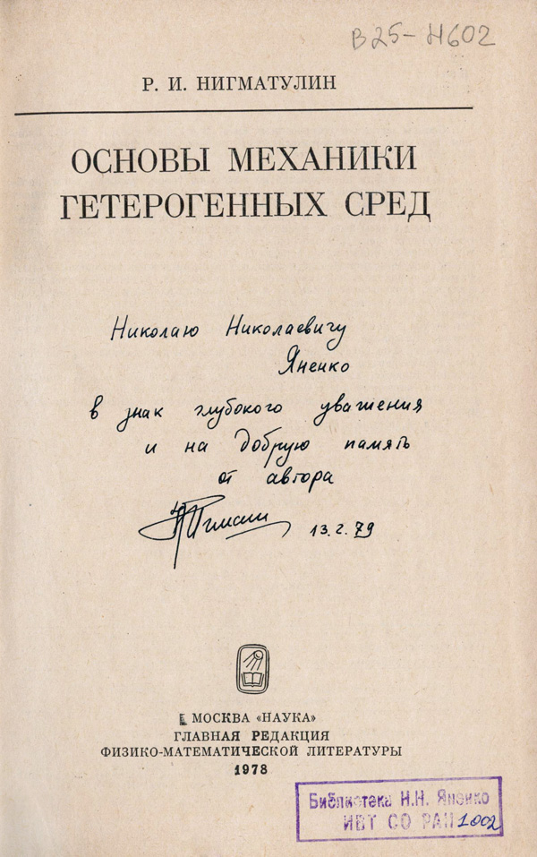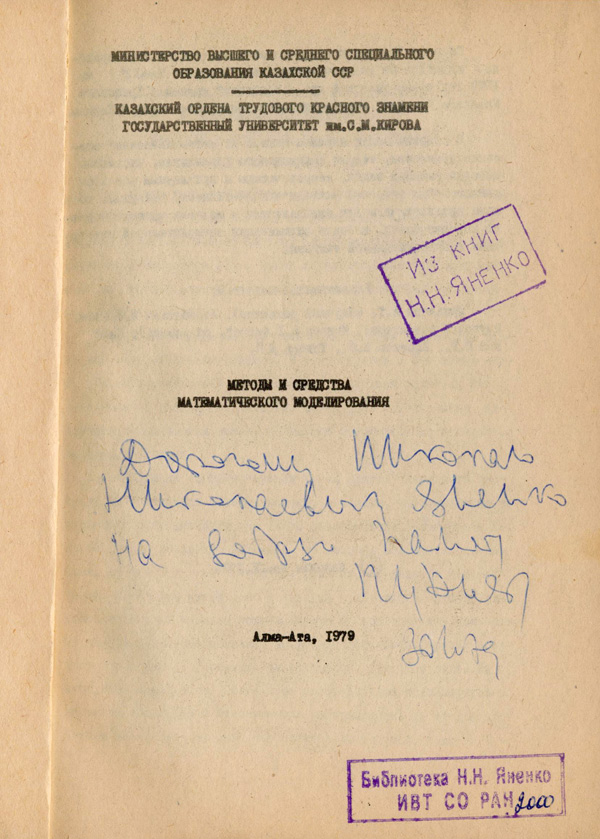 Автограф: Академику Николаю Николаевичу Яненко в знак глубокого уважения от авторов.