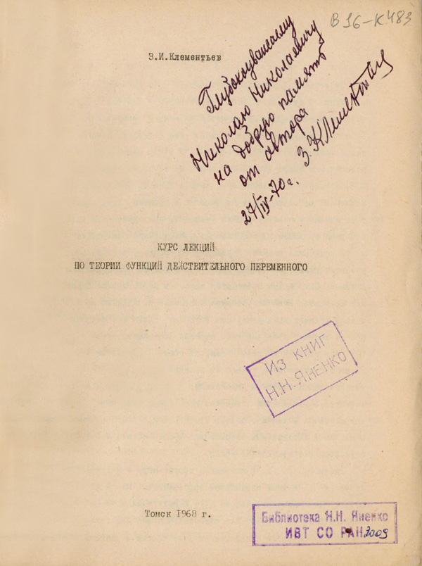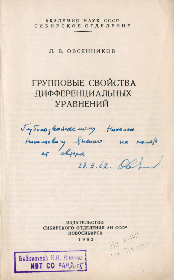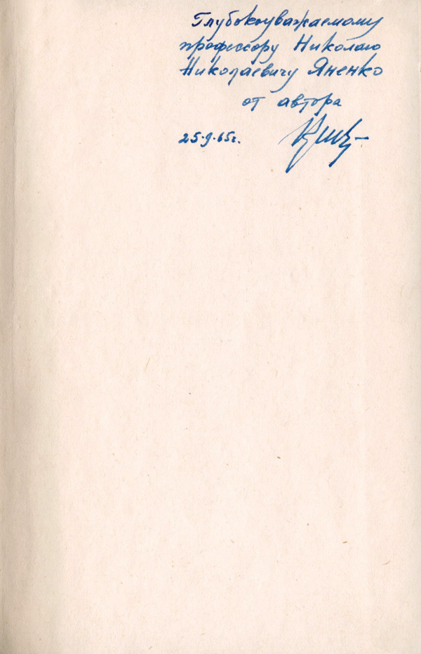 Автограф: Глубокоуважаемому профессору Николаю Николаевичу Яненко от автора. 25.9.65 г.