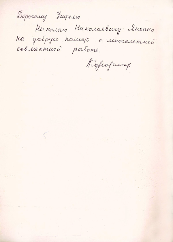 Автограф: Дорогому Учителю Николаю Николаевичу Яненко на добрую память о многолетней совместной работе. Коновалов.