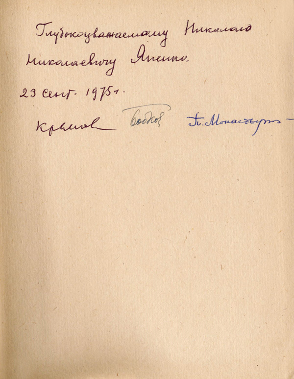 Автограф: Глубокоуважаемому Николаю Николаевичу Яненко от авторов.