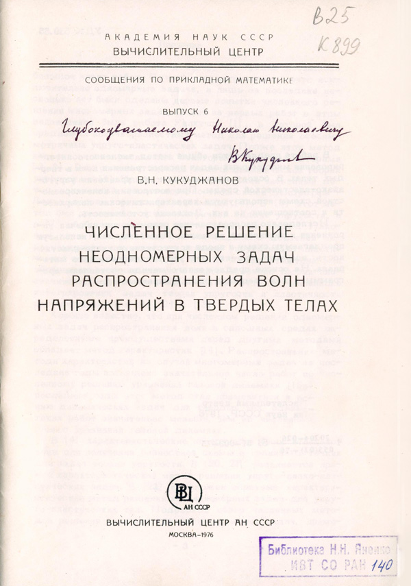 Кукуджанов В.Н. Численное решение неодномерных задач распространения волн напряжений в твердых телах / В.Н.Кукуджанов. - М.: ВЦ АН СССР, 1976. - 68 с. - (Сообщ. по прикл. математике; вып.6).