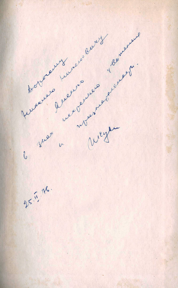 Автограф: Николаю Николаевичу Яненко в знак глубокого уважения и на добрую память от автора. 13.2.79.