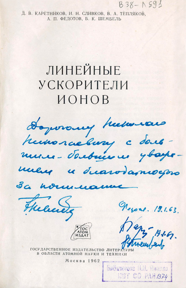 Автограф: Глубокоуважаемому Николаю Николаевичу, вдохновителю и организатору работы, включенной в эту книгу на стр.220. 21.08.78 г.