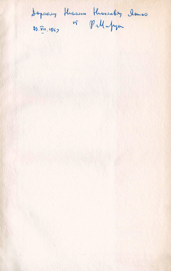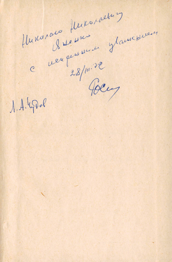 Автограф: Глубокоуважаемому Николаю Николаевичу от автора. 23.4.69.