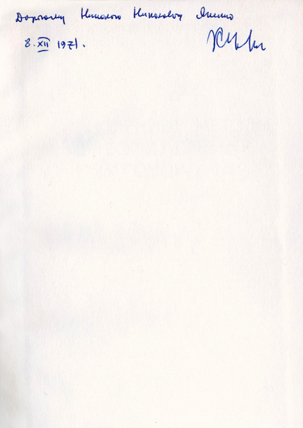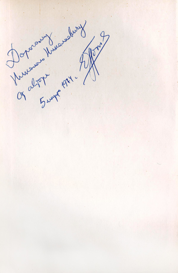 Автограф: Дорогому Николаю Николаевичу Яненко с пожеланиями всего наилучшего. 20.12.74.