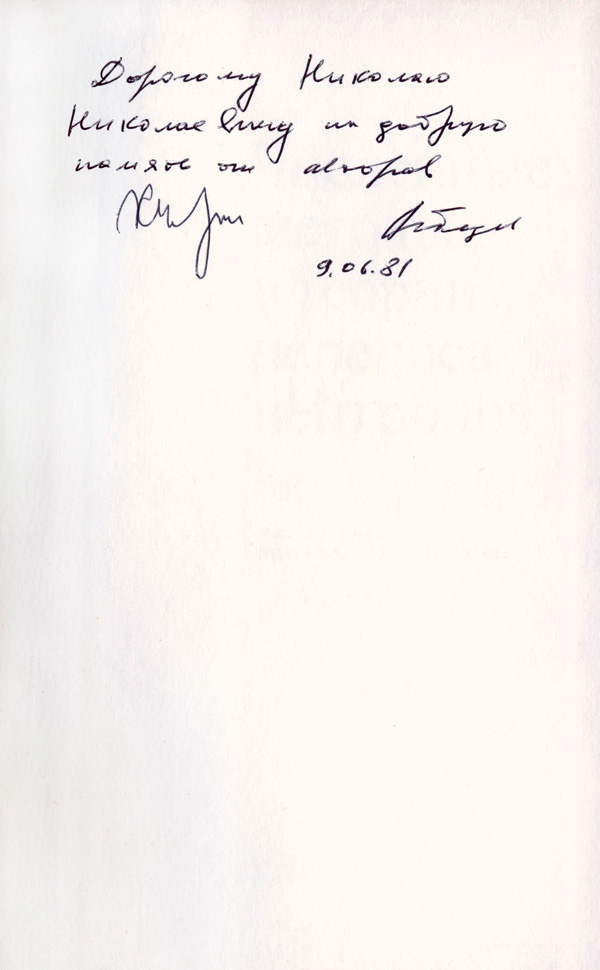 Автограф: Дорогому Николаю Николаевичу от автора с благодарностью за большую помощь в подготовке книги. 22.10.1981 г.