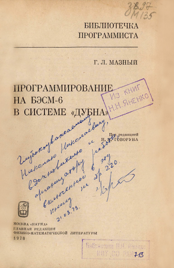 Мазный Г. Программирование на БЭСМ-6 в системе "Дубна" / под ред. Н.Н.Говоруна - М.: Наука, 1978. - 272 с. - (Б-чка программиста).