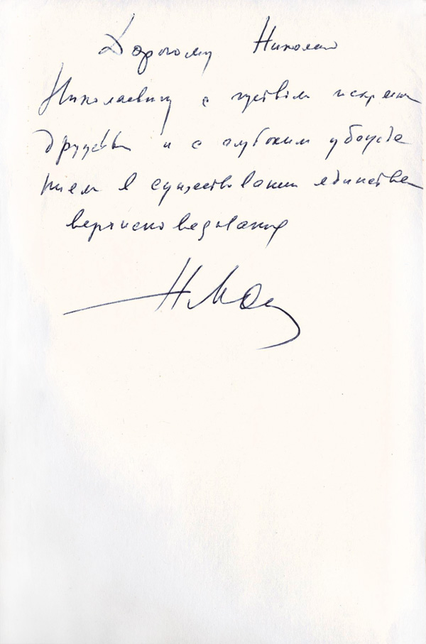 Автограф: Дорогому Николаю Николаевичу с чувством искренней дружбы и с глубоким убеждением в существовании единства вероисповедания.