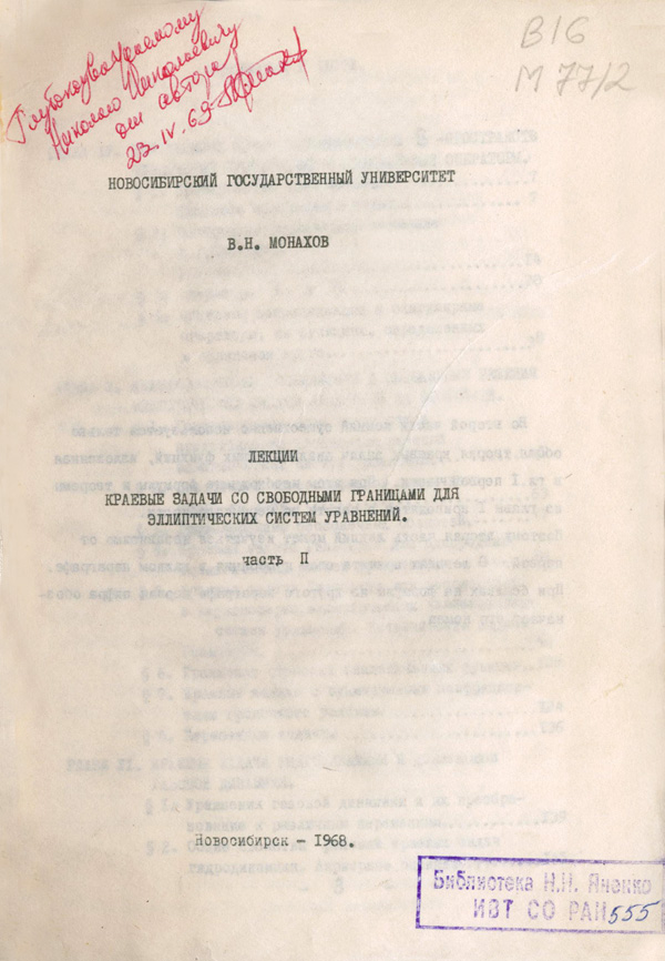 Монахов В.Н. Краевые задачи со свободными границами для эллиптических систем уравнений: лекции. - Новосибирск: [б. и.], 1968. - Ч.2. - 316 с.