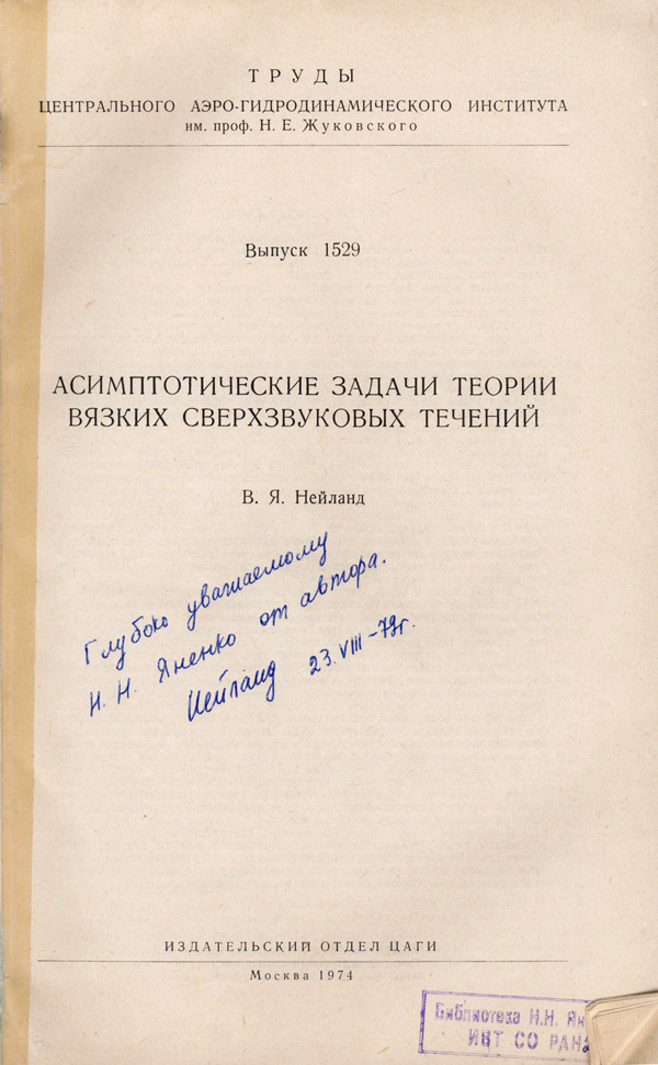 Нейланд В.Я. Асимптотические задачи теории вязких сверхзвуковых течений / В.Я.Нейланд. - М.: Изд-во ЦАГИ, 1974. - 124 с. - (Труды ЦАГИ; вып.1529).