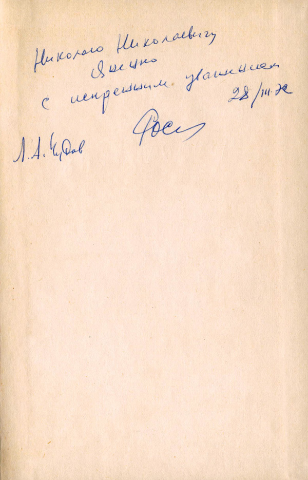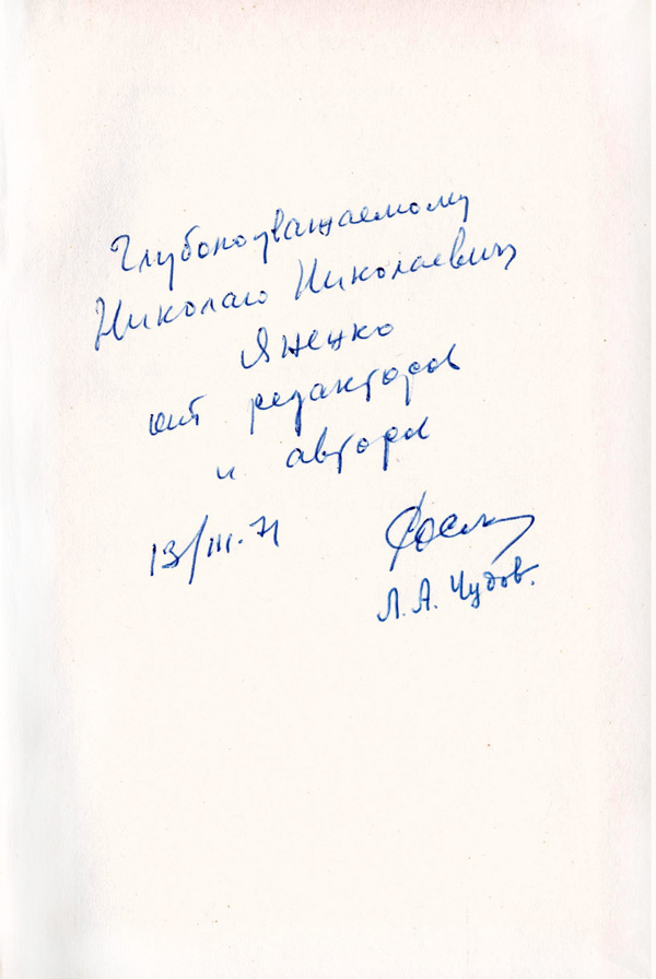 Автограф: Николаю Николаевичу Яненко с искренним уважением. 28/III.72. Л.А.Чудов. Росляков.