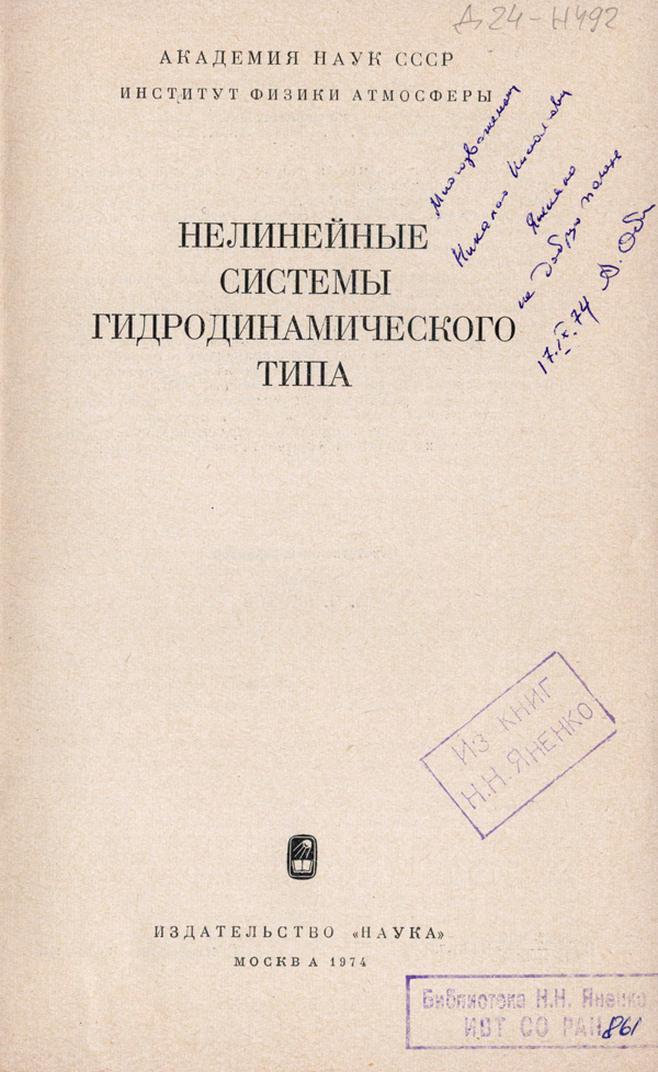Нелинейные системы гидродинамического типа / Акад. наук СССР, Ин-т физики атмосферы; ред. А.М.Обухов. - М.: Наука, 1974. - 160 с.
