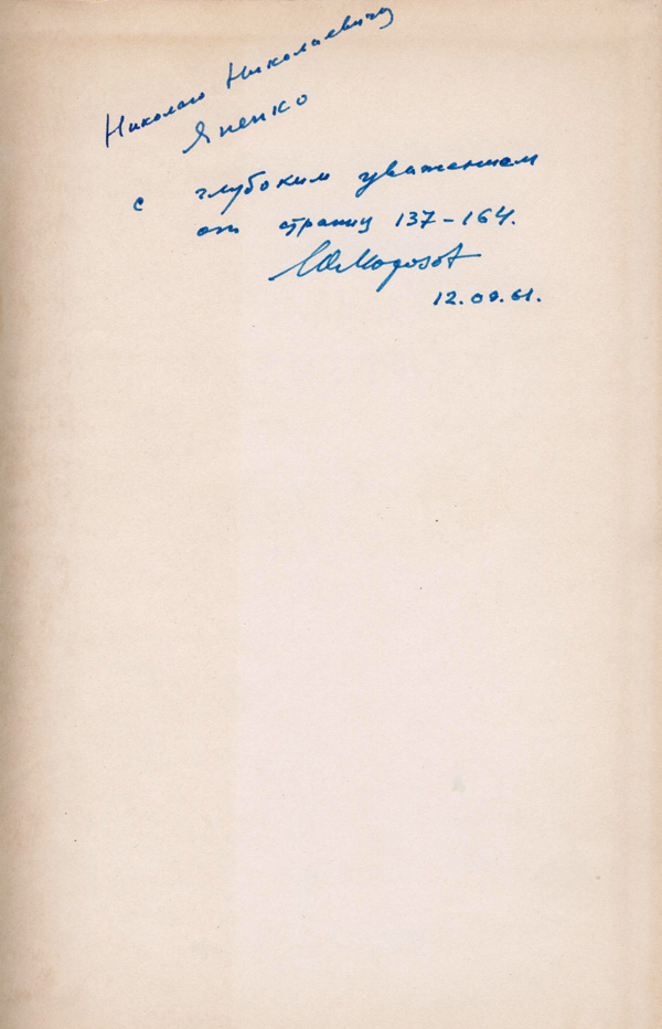 Автограф: Николаю Николаевичу Яненко с глубоким уважением от страниц 137-164. 12.09.61 (Подпись Ю.И.Морозова).
