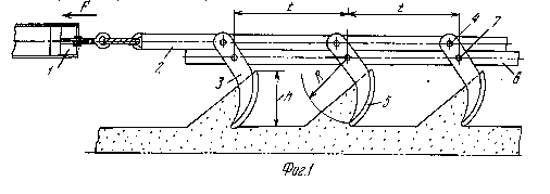 (57) Изобретение относится к горным транспортным машинам и может быть использовано для доставки сыпучих материалов по горным выработкам, в частности доставки угля к углеспускным печам под щитовой крепыо. В скребковом конвейере, включающем тяговый элемент (2) с шарнирно прикрепленными скребками (5), привод (1) возвратно-поступательного действия и систему подвески конвейера под щитовой крепыо, скребки выполняются в виде изогнутых пластин с кронштейнами (3), которыми они шарнирно крепятся к тяговому элементу (2) и шарнирно соединены между собой жесткой тягой (6). Шаг t установки скребков на тяговом элементе больше радиуса R поворота режущей кромки скребка. Величина хода I привода возвратно-поступательного действия равна или больше в целое число раз шага t установки скребков на тяговом элементе (I = kt, где k = 1,2,3... ). Повышается производительность конвейера. 2 з. п. ф-лы, 3 ил.
