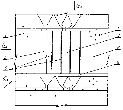 1 - динамические явления, 2 - подсечное пространство, 3 - компенсационная камера, 4 - основная панель, 5 - сближенные скважинные заряды ВВ, 6 - массив горных пород.
