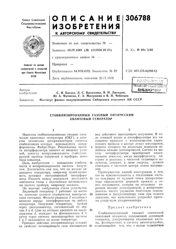 - А.с. 306788 СССР, МПК6 H 01 S 3/10. Стабилизированный газовый оптический квантовый генератор / Багаев С.Н., Василенко Л.С., Лисицын В.Н., Матюгин Ю.А., Милушкин Г.А., Чеботаев В.П.; заявитель Ин-т физики полупроводников СО АН СССР. - N 1312956; заявл. 09.04.69; опубл. 14.07.72, Бюл. N 22. - 2 с.: ил.