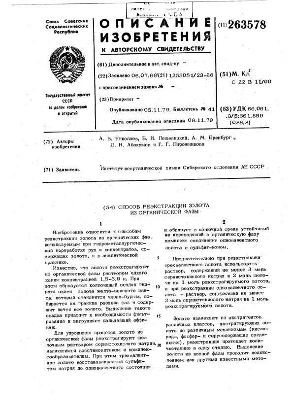 - А.с. 263578 СССР, МПК5 C 22 B 11/00. Способ реэкстракции золота из органической фазы / А.В.Николаев, Б.И.Пещевицкий, А.М.Еренбург, Д.Н.Абакумов, Г.Г.Пирожникова; заявитель Институт неорганической химии СО АН СССР. - N 1255051/23-26; заявл. 06.07.68; опубл. 05.11.79, Бюл. N 41. - 2 с.