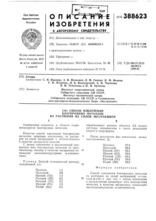 - А.с. 388623 СССР, МПК5 C 22 B 11/04, B 01 D 11/04. Способ извлечения благородных металлов из растворов их солей экстракцией / С.Н.Иванова, А.В.Николаев, Л.М.Гиндин, И.М.Иванов, Г.И.Жаркова, Л.Б.Володарский, А.П.Черняева, В.Н.Толокнова, П.И.Артюхин; заявитель Институт неорганической химии СО АН СССР, Институт органической химии СО АН СССР; СКТБ «Экстракция». - N 1654945; заявл. 10.05.71; опубл. 25.11.76, Бюл. N 43. - 1 с.