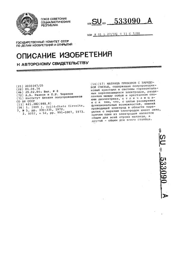 - А.с. 533090 СССР, МПК H 01 L 27/10 G 11 C 17/00. Матрица приборов с зарядовой связью / А.В.Ржанов, Е.И.Черепов; заявитель Институт физики полупроводников Сибирского отделения Академии наук СССР. - N 2010347; заявл. 01.04.74.; опубл. 28.02.84, Бюл. N 8. - 4 с.