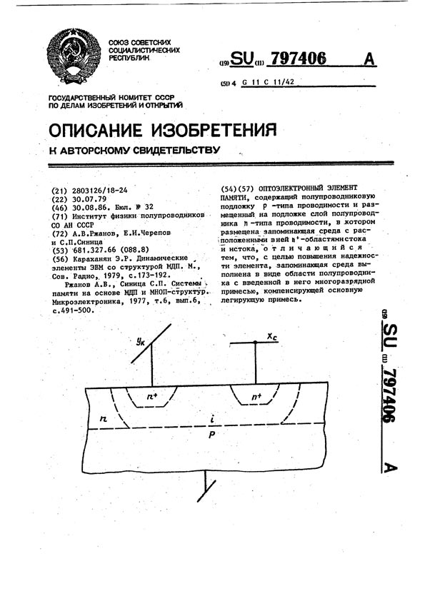 - А.с. 797406 СССР, МПК G 11 C 11/42. Оптоэлектронный элемент памяти / А.В.Ржанов, Е.И.Черепов; С.П.Синица; заявитель Институт физики полупроводников Сибирского отделения Академии наук СССР. - N 2803126; заявл. 30.07.79; опубл. 30.08.86, Бюл. N 32. - 3 с.