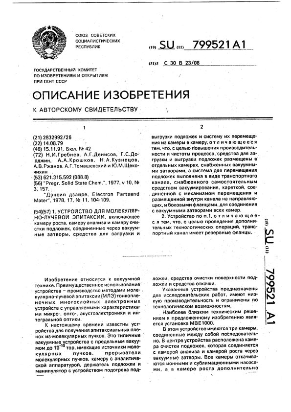 - А.с. 799521 СССР, МПК C 30 B 23/08. Устройство для молекулярнолучевой эпитаксии / Н.И.Гребнев, А.Г.Денисов, Г.С.Дорджин, А.А.Крошков, Н.А.Кузнецов, А.В.Ржанов, А.Г.Томашевский, Ю.М.Щекочихин; заявитель Предприятие п/я В-8754, Институт физики полупроводников Сибирского отделения Академии наук СССР - N 2832992; заявл. 14.08.79; опубл. 15.11.91, Бюл. N 42. - 4 с.
